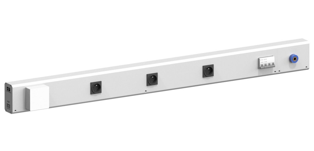 Elektrolišta, 3x zásuvka 230V / 16A, 1x jistič 230V / 16A, 1x zásuvka 400V / 16A, 1x jistič 400V / 16A, dodáváno bez přívodního kabelu (400V / max. 20A) a pneumatické hadice, s pneumatickou rychlospojkou. Šířka 1414 x výška 123 x hloubka 66 mm.
