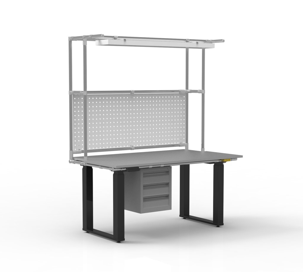 Ergonomický ESD stůl pro elektrostaticky chráněná pracoviště s praktickou nástavbou z trubkového systému. Součástí stolu je LED osvětlení, perfopanel a kontejner se třemi zásuvkami. Stůl je vybaven intuitivním ovladačem s možností uložení tří přednastavených výšek, což usnadňuje ergonomické nastavení pracovní plochy v rozmezí 680 – 1330 mm.