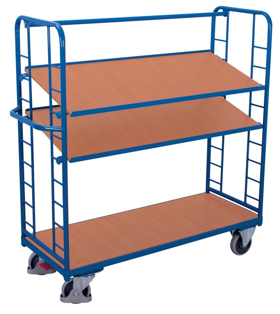 Etážový vozík s šikmými policemi. Svařovaná ocelová konstrukce, 3 police. Sklon 15°. Povrchová úprava práškovým lakem 5010 modrá. Vysoce odolná termoplastická kolečka s kuličkovým ložiskem (2 otočná s centrální brzdou Easy Stop a 2 pevná). Rozměry: výška 1535 x šířka 1510 x hloubka 550 mm. Ložná plocha 1355 x 550 mm.