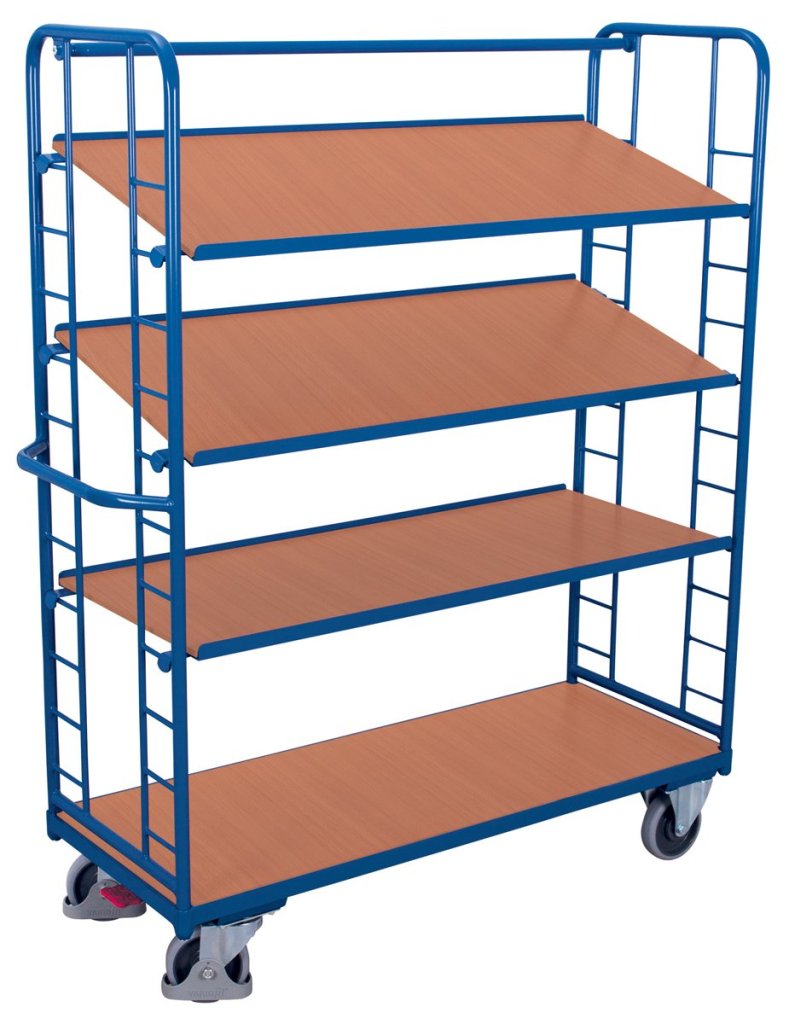 Etážový vozík s šikmými policemi. Svařovaná ocelová konstrukce, 4 police. Sklon 15°. Povrchová úprava práškovým lakem 5010 modrá. Vysoce odolná termoplastická kolečka s kuličkovým ložiskem (2 otočná s centrální brzdou Easy Stop a 2 pevná). Rozměry: výška 1855 x šířka 1805 x hloubka 650 mm. Ložná plocha 1605 x 650 mm.