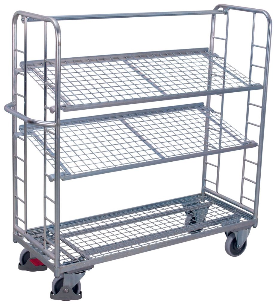 Etážový vozík s šikmými policemi. Svařovaná ocelová konstrukce, 3 police. Sklon 15°. Povrchová úprava pozink. Ložné plochy z pozinkované drátěné mřížky 50 x 50 mm. Nosnost police 50 kg. Vysoce odolná termoplastická kolečka s kuličkovým ložiskem (2 otočná s centrální brzdou Easy Stop a 2 pevná). Rozměry: výška 1535 x šířka 1510 x hloubka 550 mm. Ložná plocha 1355 x 550 mm.