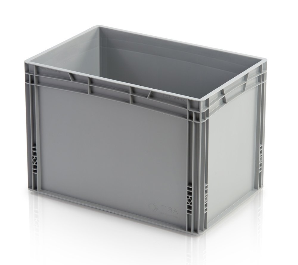 Stohovatelná Euro přepravka vhodná pro dlouhodobé skladování i do výroby. Je stabilní během přepravy, kompatibilní s Euro paletami. Má plné dno a stěny s uzavřenými rukojetěmi. Barva šedá. Objem 54 l.