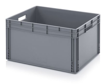 Stohovatelná Euro přepravka vhodná pro dlouhodobé skladování i do výroby. Je stabilní během přepravy, kompatibilní s Euro paletami. Má plné dno a stěny s uzavřenými rukojetěmi. Barva šedá. Objem 67 l.