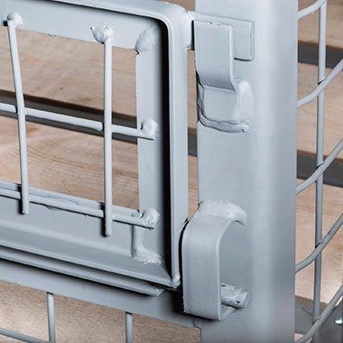 Čtyřcestná ohradová paleta - Gitterbox. Vnější rozměr 1240 x 835 x 500 mm, drátěné stěny, přední stěna sklopná napůl. Nosnost 900 celý popis a parametry