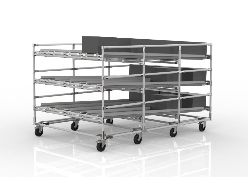 Gravitační regál FIFO s kolečky z trubkového stavebnicového systému. Součástí je systém FIFO (First in, First out), který využívá celý popis a parametry