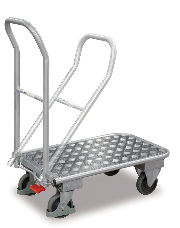 Hliníkový skládací vozík s nosností 150 kg. Svařovaná hliníková konstrukce. 1 ložná plocha z profilovaného hliníkového plechu. Vysoce odolná pryžová kolečka s kuličkovým ložiskem. Rozměry: výška 950 x šířka 815 x hloubka 415 mm. Super lehká konstrukce.