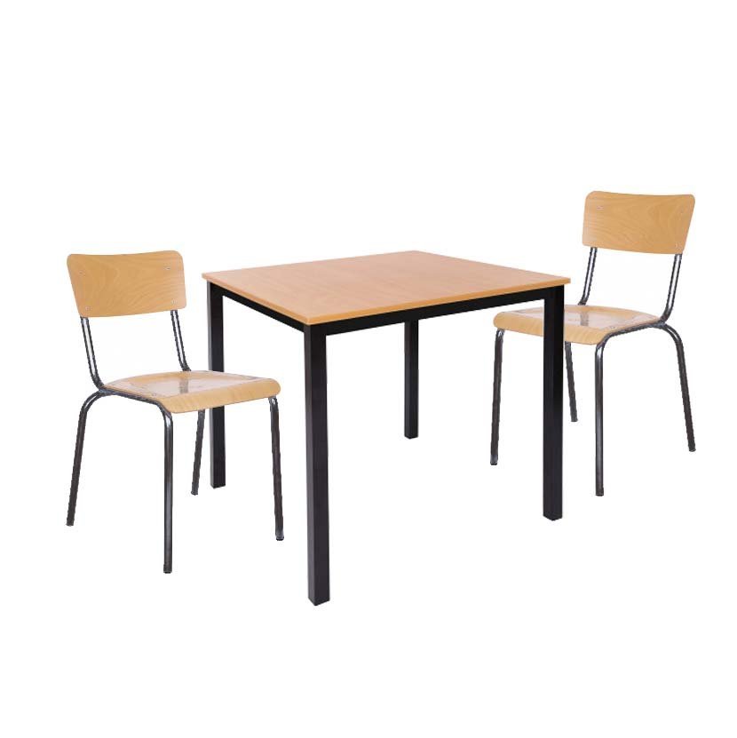 2x skořepinová židle UNI s kovovou konstrukcí, 1x jídelní stůl DEMONT 800 x 800 mm. Sedák a opěrák židle s možností moření v několika odstínech. Stolová deska lamino tl. 18 mm v několika dezénech.