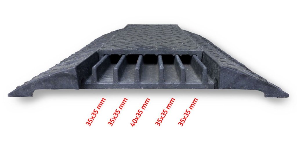 Kabelový most křižovatka černý s víkem. Slouží k ochraně kabelů, hadic, trubek, které jsou položeny přes vozovku, ve výrobních provozech, výstavy, kulturní akce atd. Chemicky stálý, nesnadno hořlavý, snadno se udržuje. Rychlá montáž a demontáž, protiskluznost a stabilita. Záruka 2 roky.