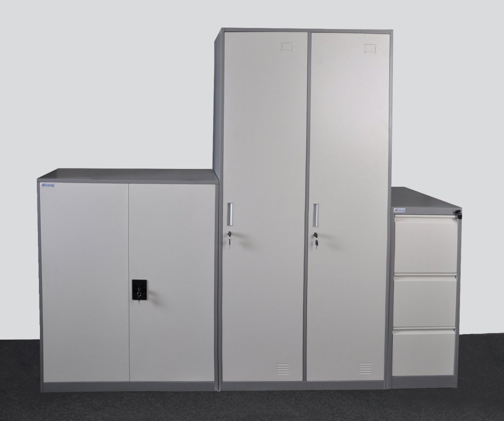 Sestava kancelářských skříní skládající se ze spisové, šatní a roletové skříně. Vše vyráběno z kvalitního a pevného ocelového plechu tloušťky 0,6mm. Povrchová úprava práškovou barvou – korpus tmavě šedý, roleta světle šedá, dveře bílé. Demont, snadná a rychlá montáž dle přiloženého návodu.