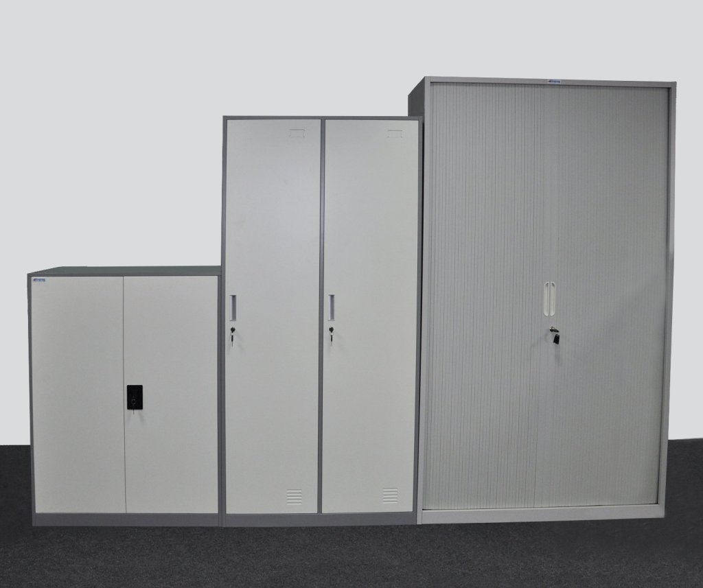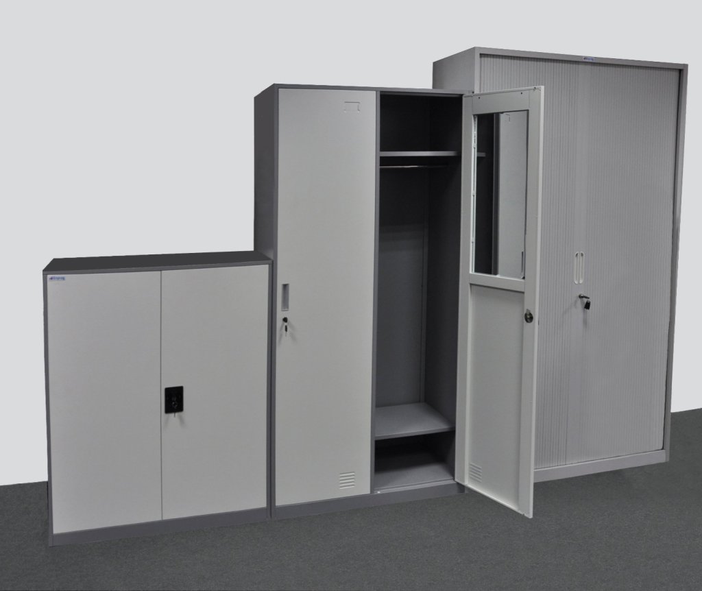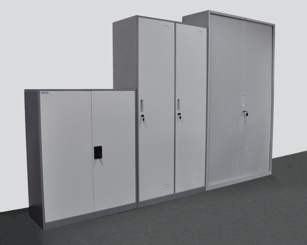 Sestava kancelářských skříní skládající se z kartotéky pro formát A4, spisové a šatní skříně. Vše vyráběno z kvalitního a pevného ocelového plechu tloušťky 0,6mm. Povrchová úprava práškovou barvou – korpus tmavě šedý, dveře a zásuvky bílé. Demont, snadná a rychlá montáž dle přiloženého návodu.