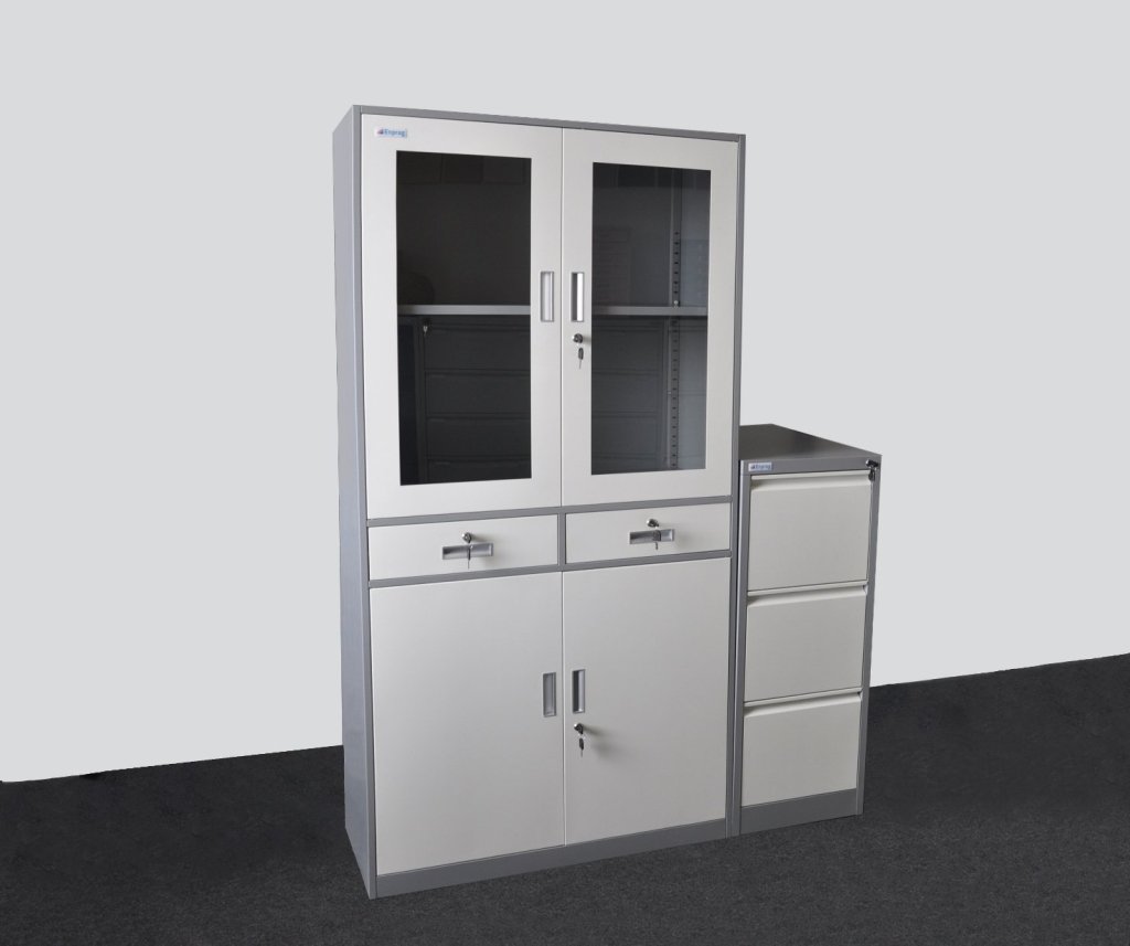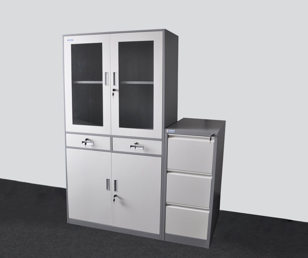 Sestava kancelářských skříní skládající se z kartotéky pro formát A4 a spisové skříně. Vše vyráběno z kvalitního a pevného ocelového plechu tloušťky 0,6mm. Povrchová úprava práškovou barvou – korpus tmavě šedý, dveře a zásuvky bílé. Demont, snadná a rychlá montáž dle přiloženého návodu.
