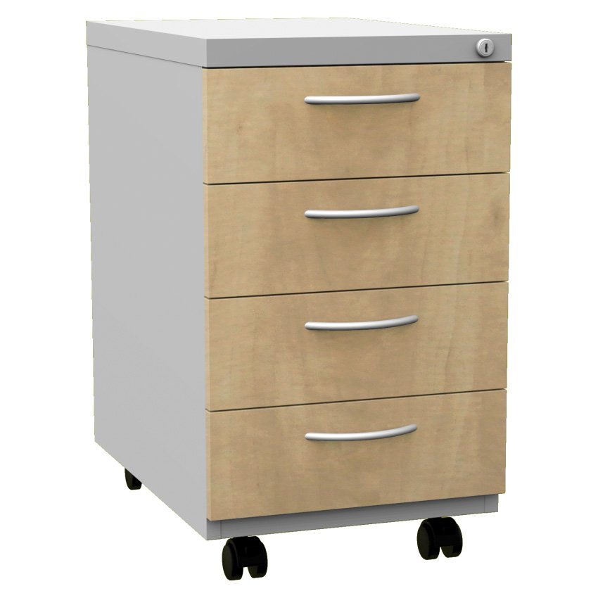 Kancelářské kontejnery mobilní, centrální zámek, jedna standardní zásuvka, jedna na závěsné pořadače. Výška 495 nebo 501, šířka 420, hloubka 565 mm. Páté kolečko na spodní hraně hluboké zásuvky zajišťuje stabilitu i při jejím úplném otevření. Varianta bez horní desky nebo s horní dekorativní deskou tloušťky 6 mm. Výsuv standardní zásuvky 80 nebo 100%, výsuv vysoké zásuvky 100%.