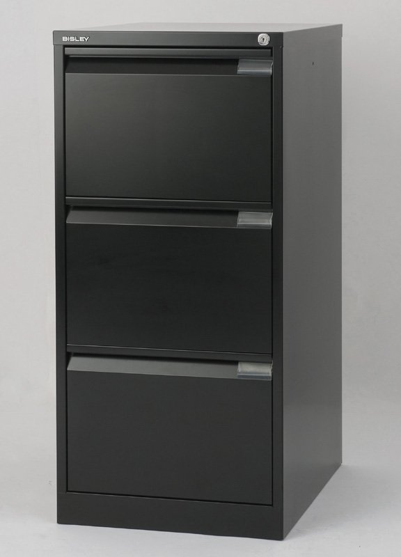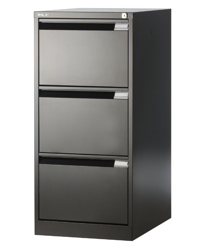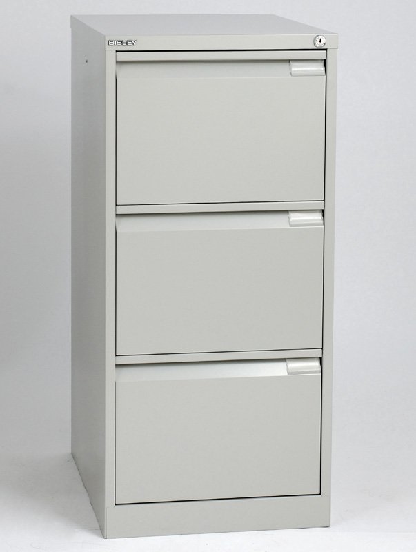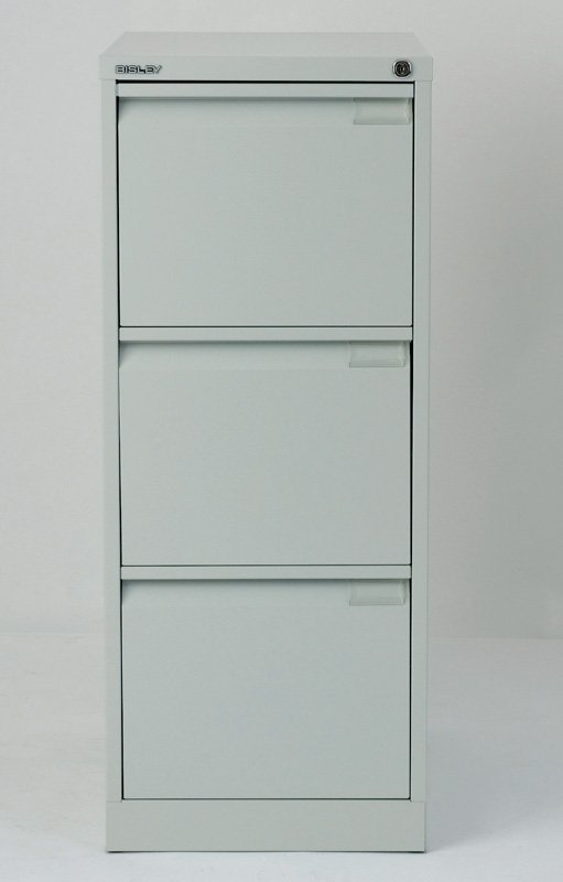 Třízásuvkové kovové kartotéky pro dokumenty nebo závěsné pořadače formátu A4 nebo Foolscap, šířka 413 nebo 470, výška 1016, hloubka 622 mm, centrální zámek, různé barvy. Součástí každé zásuvky je vložené perforované dno + 2x dělící příčka. V barvě světle šedé nebo béžové (šířce 413 mm) skladem.
