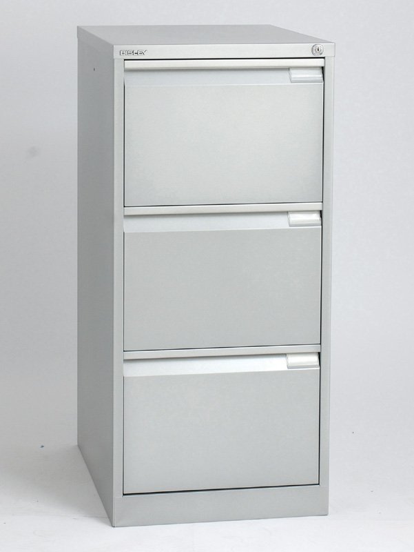 Třízásuvkové kovové kartotéky pro dokumenty nebo závěsné pořadače formátu A4 nebo Foolscap, šířka 413 nebo 470, výška 1016, hloubka 622 mm, centrální zámek, různé barvy. V barvě světle šedé nebo béžové (šířce 413 mm) skladem.