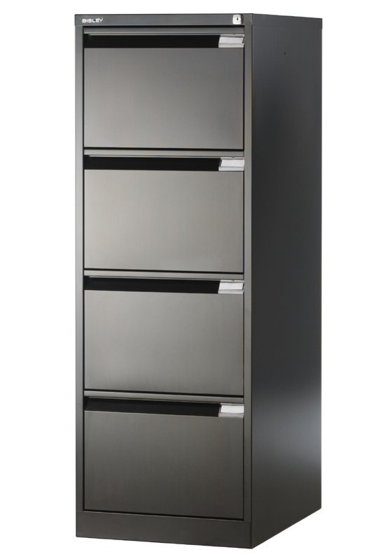 Čtyřzásuvková kovová kartotéka pro dokumenty nebo závěsné pořadače formátu A4 nebo Foolscap, šířka 470, výška 1321, hloubka 622 mm, centrální zámek, různé barvy. Primárně kartotéka slouží pro ukládání širších formátů Foolscap, ale každá zásuvka je vybavena redukční lištou pro případ ukládání závěsných kapes formátu A4 nebo Folio.