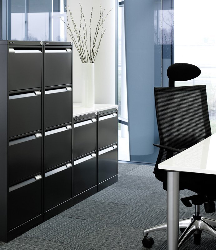 Čtyřzásuvkové kovové kartotéky pro dokumenty nebo závěsné pořadače formátu A4 nebo Foolscap, šířka 413 nebo 470, výška 1321, hloubka 622 mm, centrální zámek, různé barvy. V barvě světle šedé, béžové a bílé skladem.