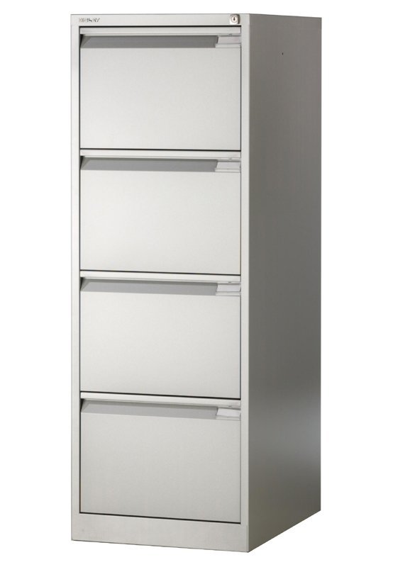 Čtyřzásuvkové kovové kartotéky pro dokumenty nebo závěsné pořadače formátu A4 nebo Foolscap, šířka 413 nebo 470, výška 1321, hloubka 622 mm, centrální zámek, různé barvy. V barvě světle šedé, béžové a bílé skladem.