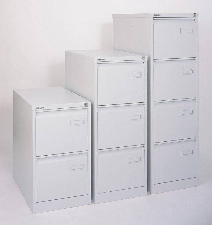 Třízásuvkové kovové kartotéky pro dokumenty nebo závěsné kapsy formátu A4 a Foolscap, šířka 413 nebo 470, výška 1016, hloubka 622 mm, centrální zámek, různé barvy.