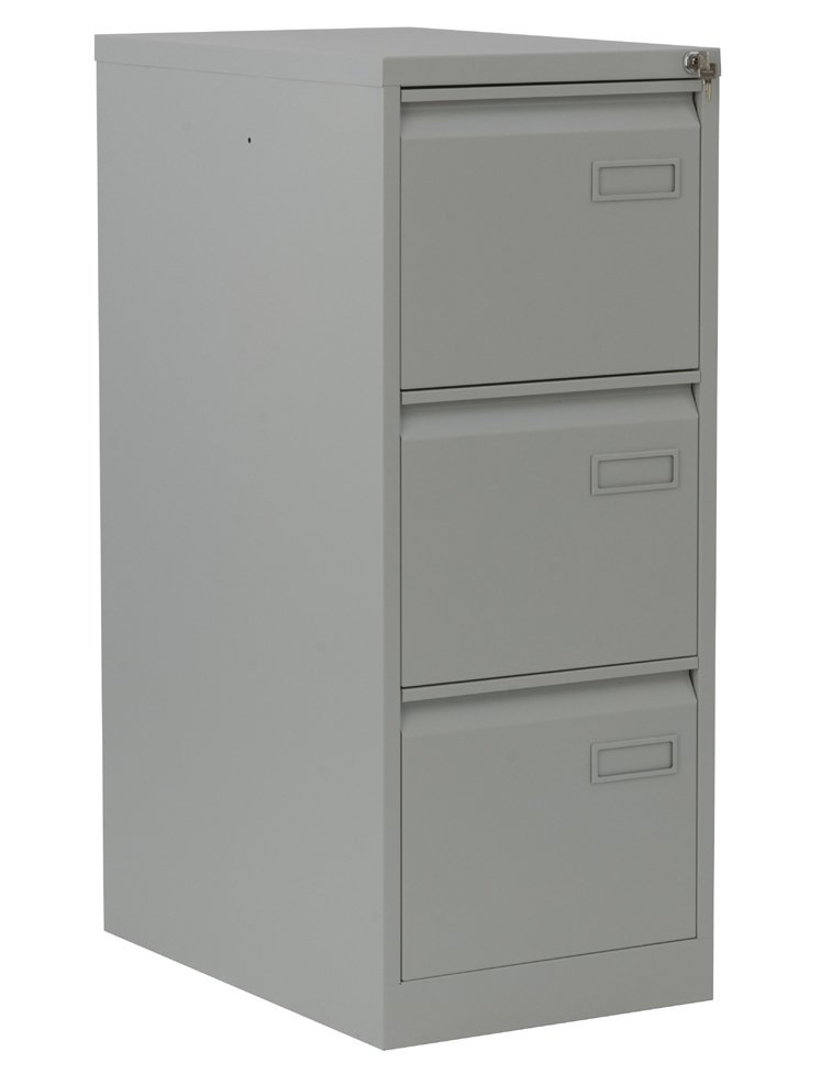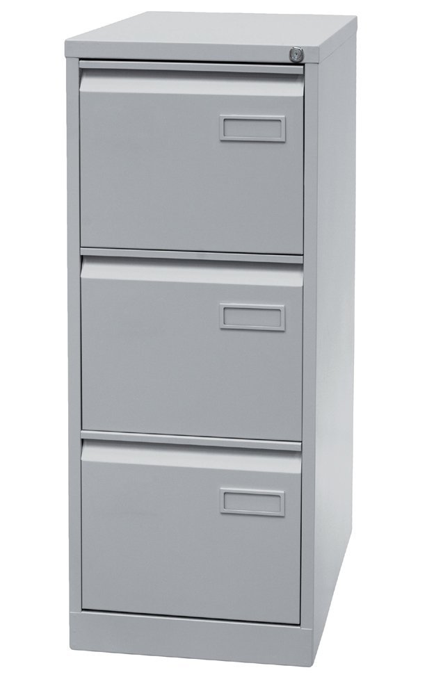 Třízásuvkové kovové kartotéky pro dokumenty nebo závěsné pořadače formátu A4 nebo Foolscap, šířka 413 nebo 470, výška 1016, hloubka 622 mm, centrální zámek, různé barvy. V barvě světle šedé nebo béžové (šířce 413 mm) skladem.