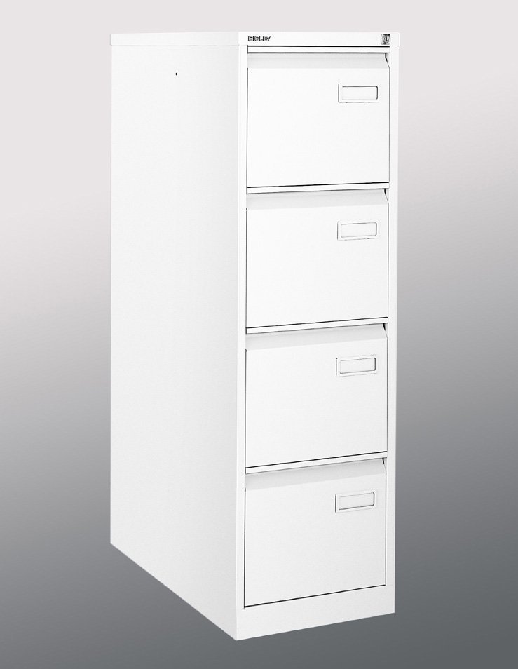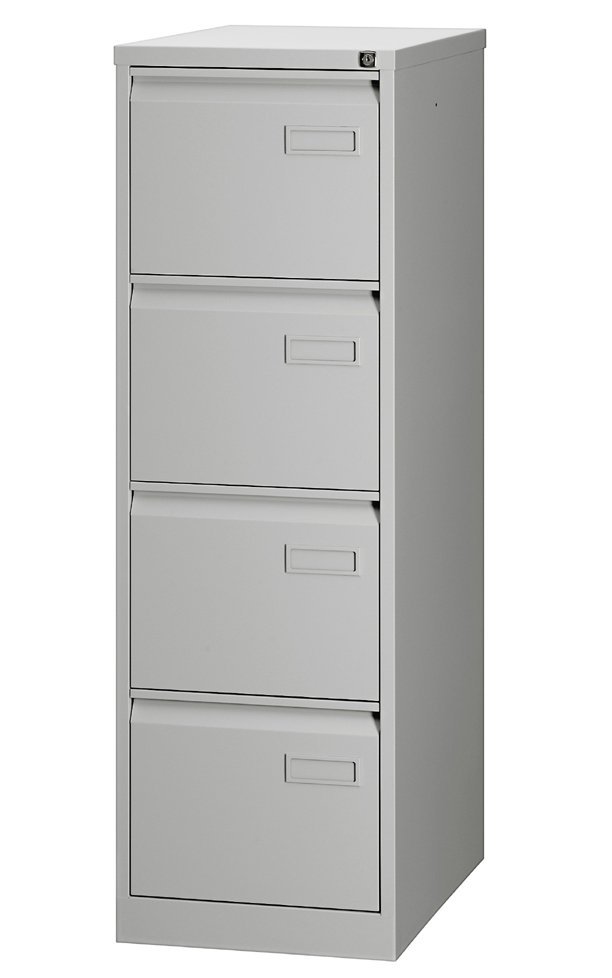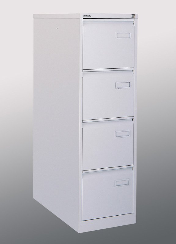 Čtyřzásuvkové kovové kartotéky pro dokumenty nebo závěsné pořadače formátu A4 nebo Foolscap, šířka 413 nebo 470, výška 1321, hloubka 622 mm, centrální zámek, různé barvy. V barvě světle šedé, béžové a bílé skladem.