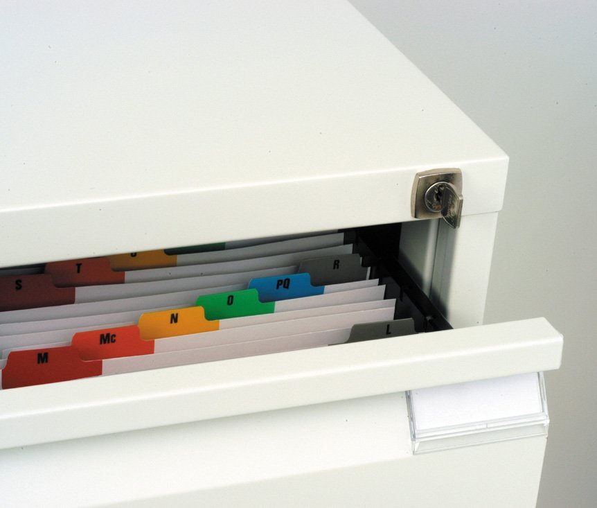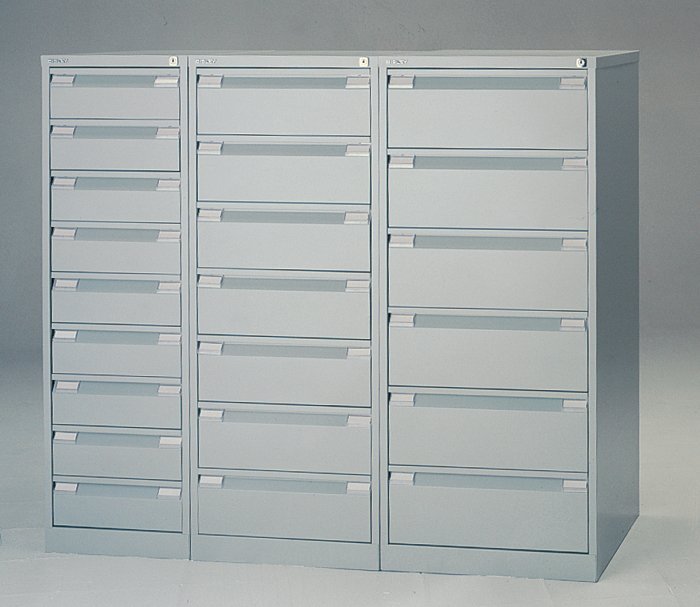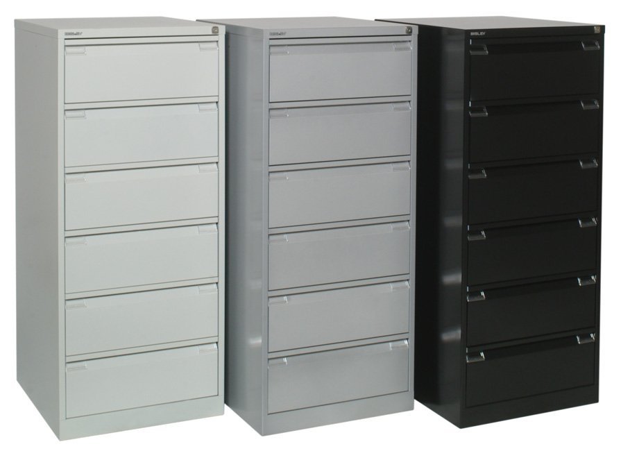 Třízásuvkové kovové kartotéky pro dokumenty nebo závěsné pořadače formátu A4 nebo Foolscap, šířka 413 nebo 470, výška 1016, hloubka 622 mm, centrální zámek, různé barvy. V barvě světle šedé nebo béžové (šířce 413 mm) skladem.