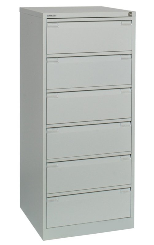 Šestizásuvkové kovové kartotéky na obálky formátu A5 (archivovaný doklad může mít šířku až 235 mm), celková šířka 568, výška 1321, hloubka 622 mm, různé barvy. V barvě světle šedé RAL 7035 skladem.