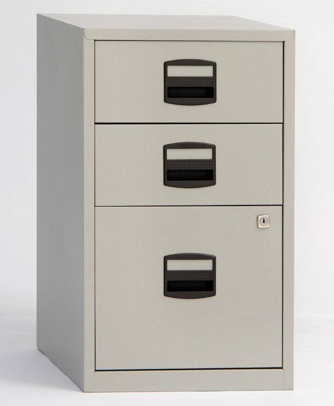 Třízásuvkové kovové kartotéky Bisley PFA3 pro dokumenty a závěsné kapsy formátu A4, šířka 413, výška 672, hloubka 400 mm, různé barvy. POZOR - vhodné pouze pro omezené používání - např. pro domácí kancelář. Při plném kancelářském provozu má kartotéka zkrácenou životnost.