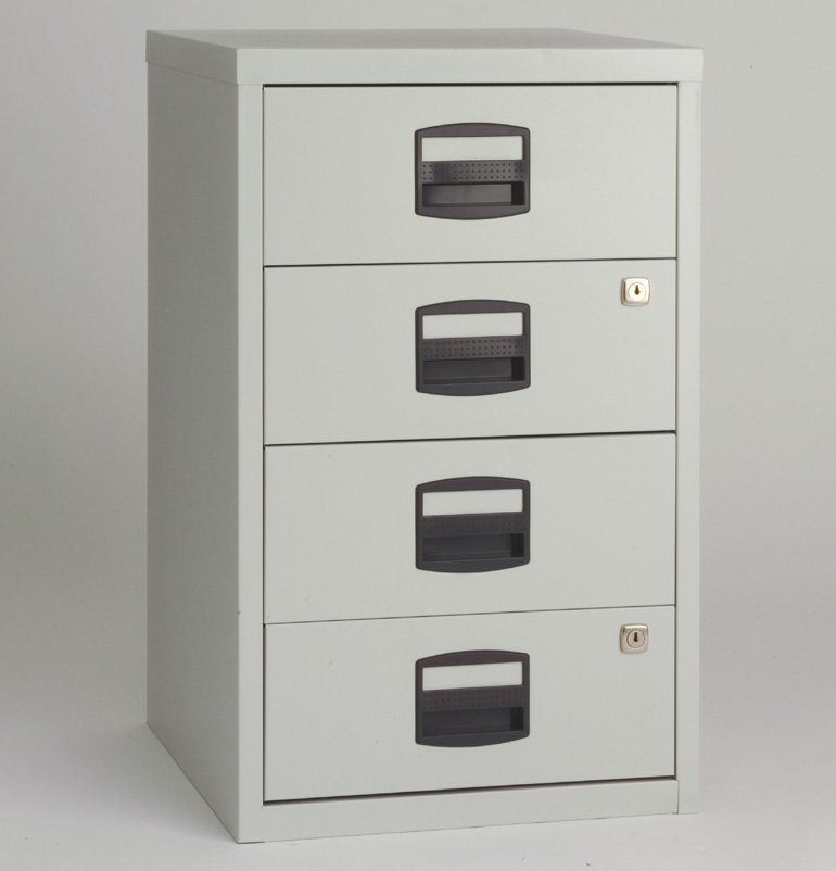 Čtyřzásuvkové kovové kartotéky PFA4S na dokumenty, šířka 413, výška 672, hloubka 400 mm, různé barvy. POZOR - vhodné pouze pro omezené používání - např. pro domácí kancelář. Při plném kancelářském provozu má kartotéka zkrácenou životnost.