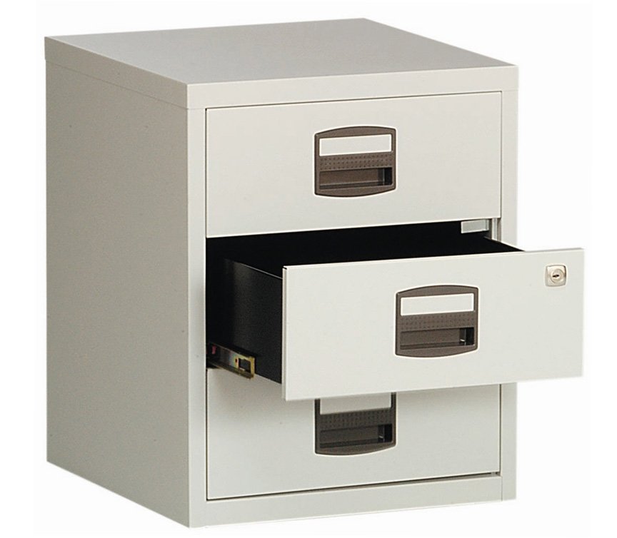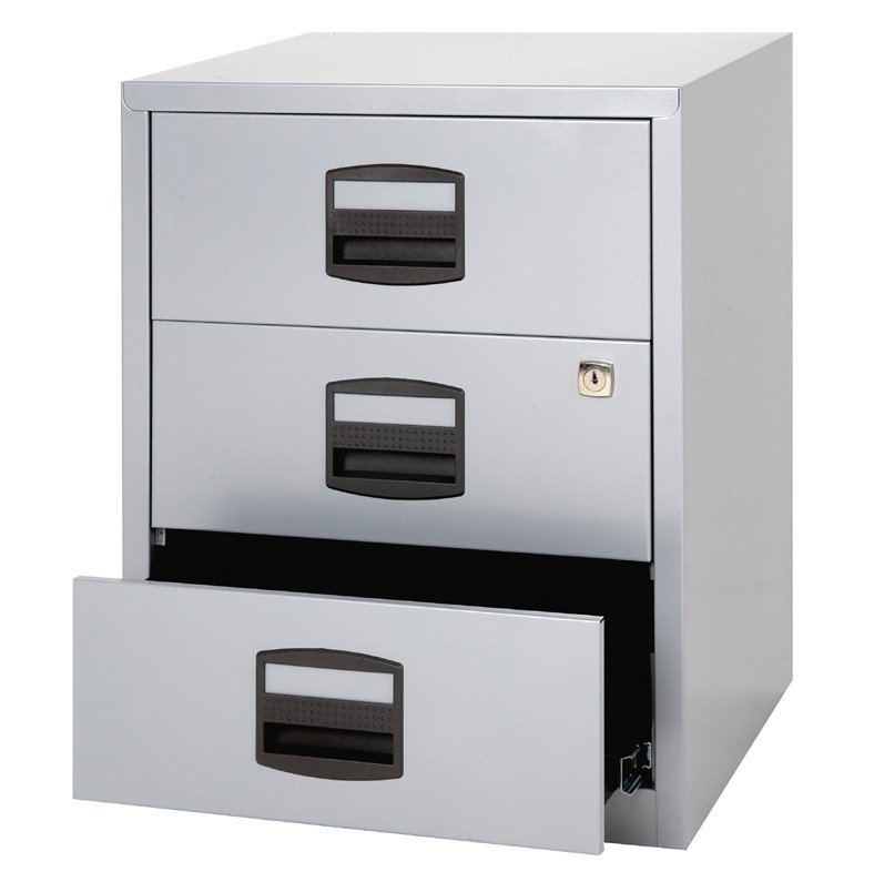 Třízásuvkové kovové kartotéky PFAM3S na dokumenty formátu A4, šířka 413, výška 529, hloubka 400 mm, různé barvy. POZOR - vhodné pouze pro omezené používání - např. pro domácí kancelář. Při plném kancelářském provozu má kartotéka zkrácenou životnost.