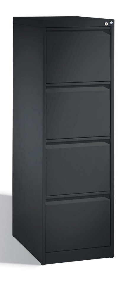 Čtyřzásuvkové kovové kartotéky pro dokumenty nebo závěsné pořadače formátu A4 nebo Foolscap, šířka 413 nebo 470, výška 1321, hloubka 622 mm, centrální zámek, různé barvy.