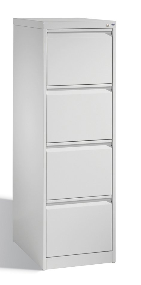 Čtyřzásuvkové kovové kartotéky pro dokumenty nebo závěsné pořadače formátu A4 nebo Foolscap, šířka 413 nebo 470, výška 1321, hloubka 622 mm, centrální zámek, různé barvy. V barvě světle šedé, béžové a bílé skladem.