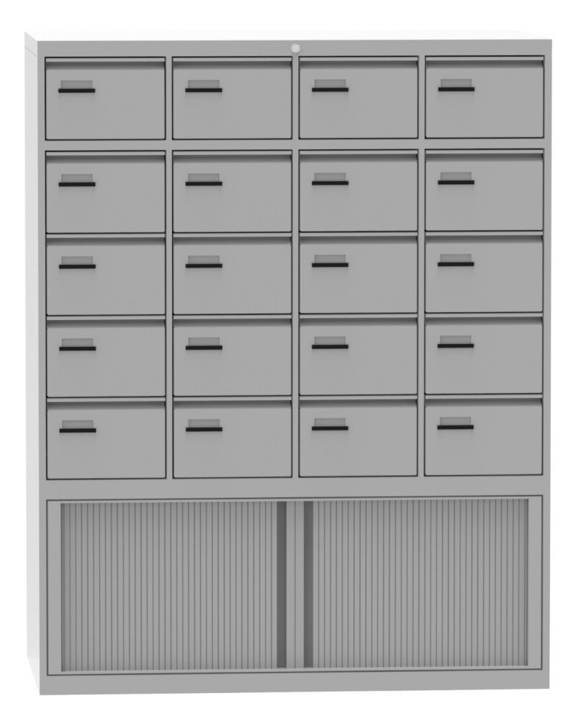 Dvacetizásuvková kovová kartotéka pro dokumenty formátu A5, šířka 1122, výška 1350, hloubka 590 mm. Vnitřní rozměr každého oddělení výška 161 x šířka 217 x hloubka 520 mm. Barva šedá RAL 7035.