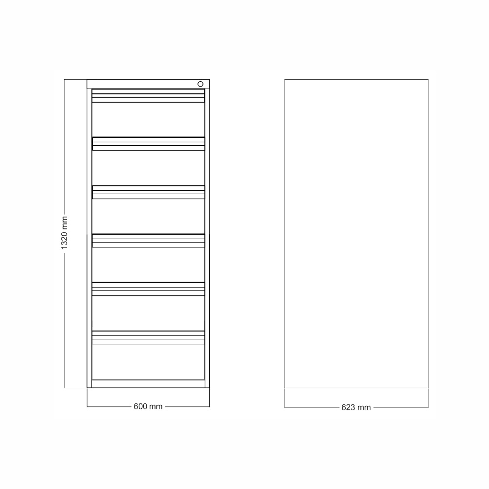 Šestizásuvková kartotéka pro dokumenty formátu A5, B5 a C5. Výška 1320 x šířka 600 x hloubka 623 mm. Plný výsuv zásuvek na celý popis a parametry