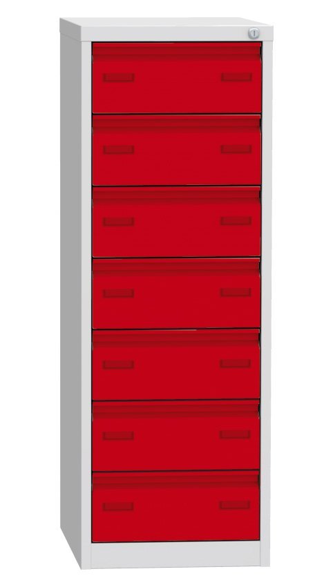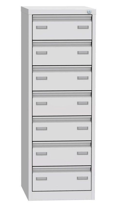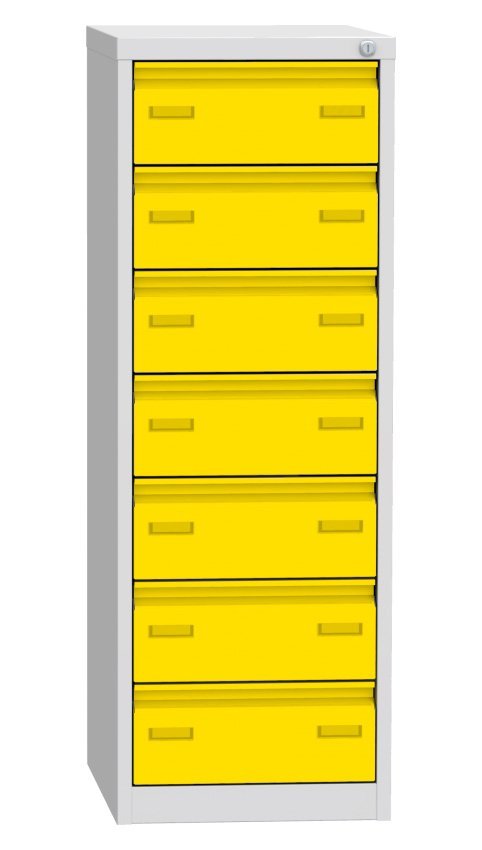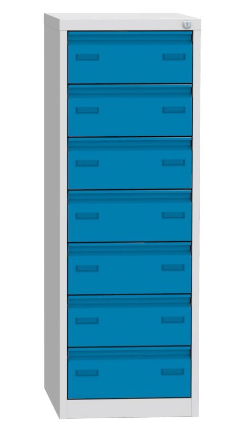 Lístkovnice pro formáty A6 sedmizásuvková (v každé zásuvce jsou 2 oddělení). Výška 1250 x šířka 440 x hloubka 600 mm. Kovový korpus v barvě světle šedé RAL 7035, zásuvky v různých barvách, centrální zámek.
