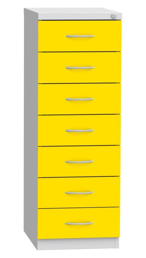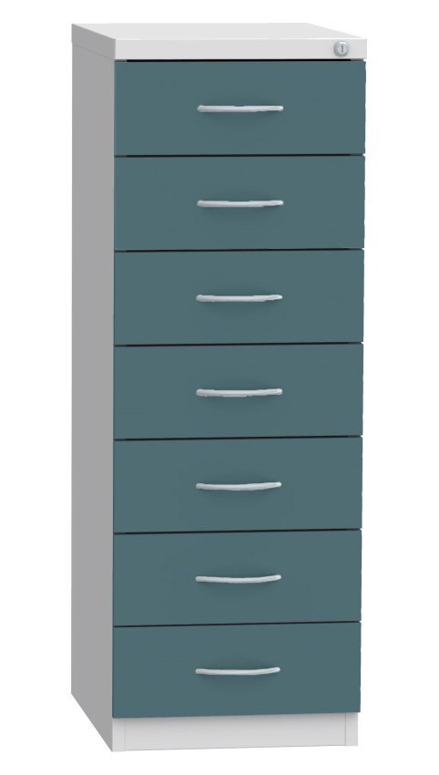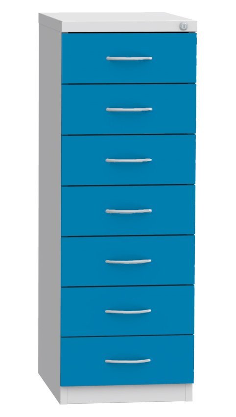 Lístkovnice pro formáty A6 sedmizásuvková (v každé zásuvce jsou 2 oddělení). Výška 1250 x šířka 440 x hloubka 600 mm. Kovový korpus v barvě světle šedé RAL 7035, zásuvky v různých barvách, centrální zámek.