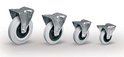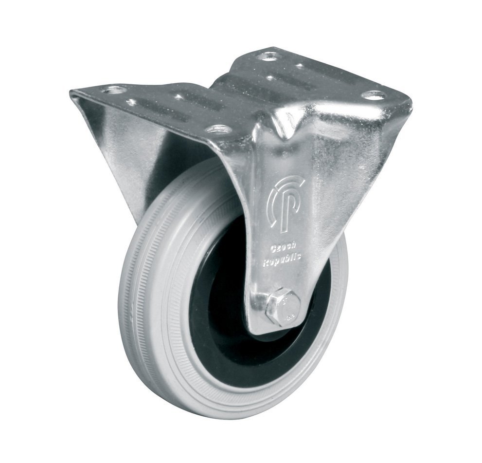 Kola gumová, pevná nebo otočná s brzdou, průměr 100, 125, 160 nebo 200 mm. Šedá guma zajistí tichý pohyb a nešpiní podlahu.