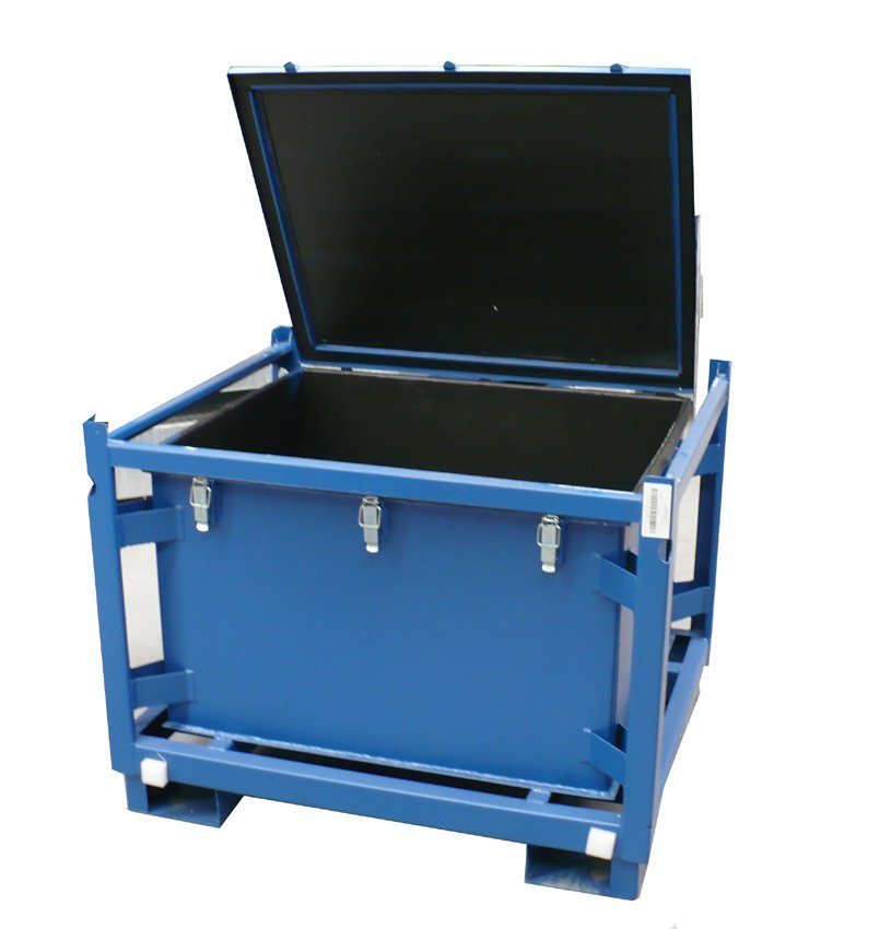Vhodný pro skladování a přepravu pevných a pastovitých látek. Konstrukce z ocelových nosníků a plechů, víko osazeno těsněním z pěnové gumy. Povrchová úprava - v lakovaném provedení (na výběr červená nebo modrá barva), s gumovou výstelkou. Objem 500 l. U tohoto výrobku doprava i s hodnotou nákupu nad 5000,- Kč bez DPH hrazena dle místa dodání.
