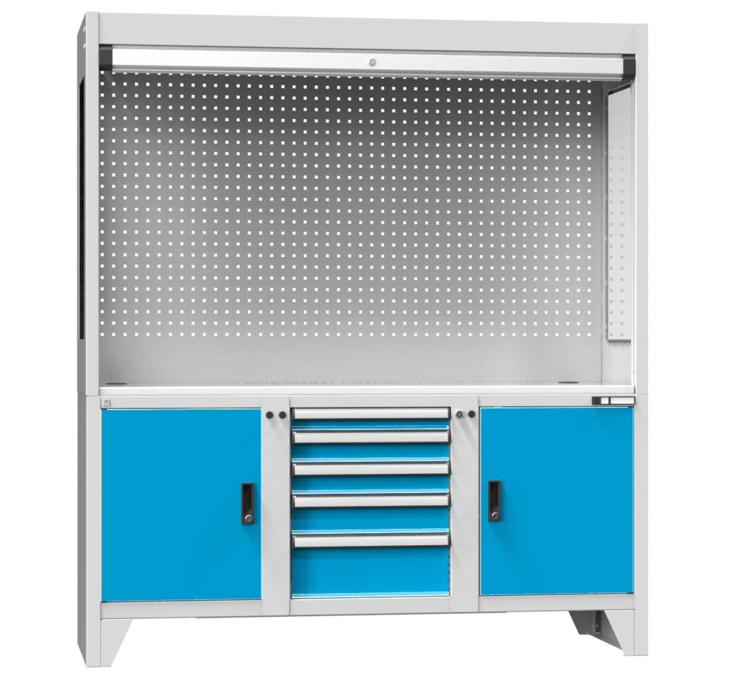 Laminovaná pracovní deska tloušťky 28 mm, 5x zásuvka – 1x 75E, 2x 100E, 1x 125E 1x 200E, 2x dvířka 600 mm, 2x police stavitelná po 25 mm, samonavíjecí roleta s hliníkových lamel RAL 7035, tvrzená boční skla, perforovaná zadní stěna. Výška 2030, šířka 1800, hloubka 800 mm.