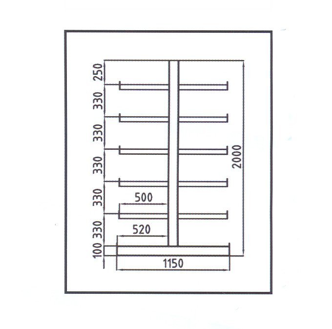 Regály pro střední zatížení pro stojící a ležící dlouhý materiál. Výška 2000 - 3000 mm, šířka 1000 nebo 1300 mm, hloubka 1000 nebo 1600 mm, počet ramen 8 - 10 na jednu stojinu, nosnost ramene 250 nebo 430 kg, nosnost jednostranné stojiny 1250 - 2340 kg, hmotnosti regálů mezi 50 - 202 kg. Barva RAL 5010 modrá. Pouze jedna stojina, slouží jako prodloužení základních regálů.