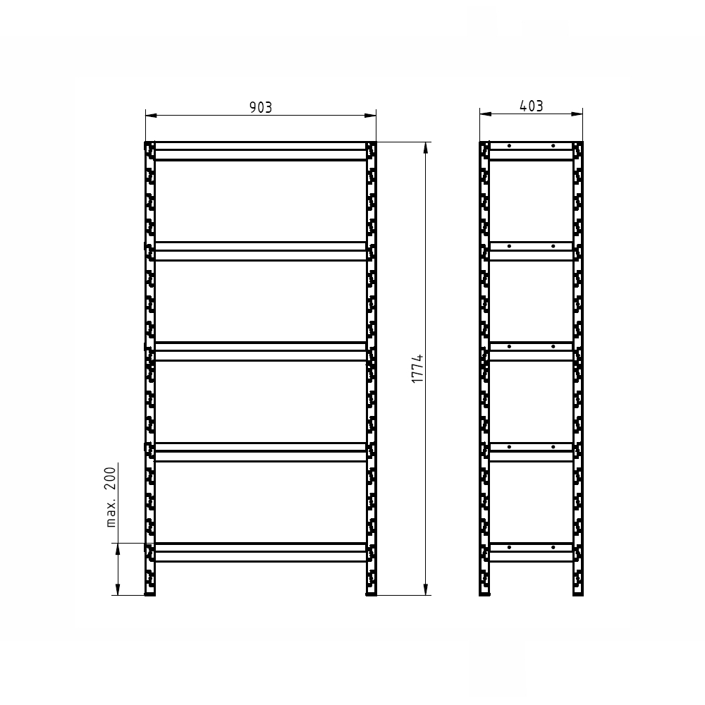 Kovové bezšroubové regály určené k širokému použití. Nosnost police stanovena na maximální rovnoměrné zatížení 175 kg a slouží k ukládání středně těžkých předmětů. Hloubka regálů 400 - 600 mm, šířka 900 - 1600 mm, výška 1770 - 2000 mm, 5 - 6 polic.