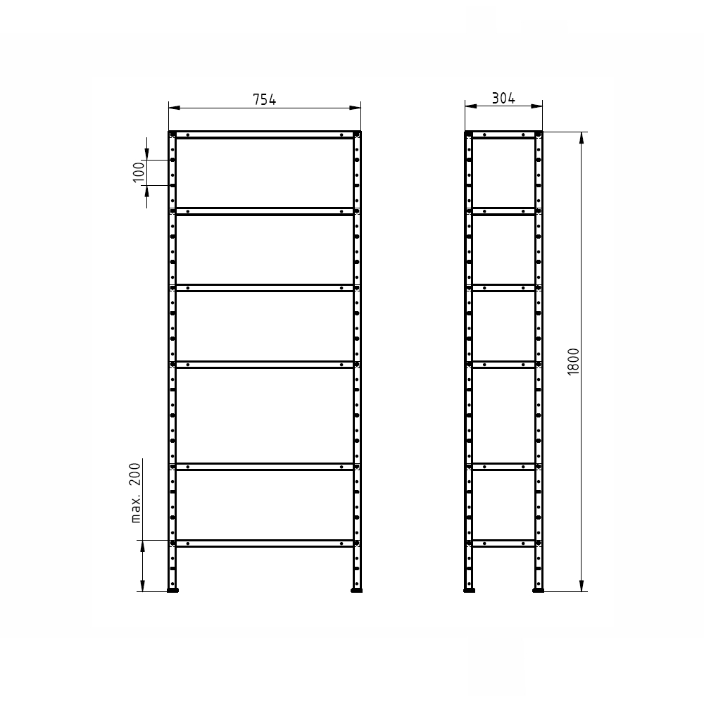Lehký kovový šroubový regál určený k širokému použití, výška 1800, šířka 750, hloubka 300 mm. Nosnost police je stanovena na maximální rovnoměrné zatížení 50 kg a slouží k ukládání lehčích předmětů. Police jsou volně přestavitelné po 50 mm. Jednoduchá montáž pomocí šroubových spojů.