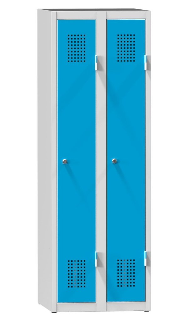Dvoudveřová kovová šatní skříňka šířka 500 mm, výška 1500 mm, hloubka 500 mm, v horní části každého oddělení je tyč se třemi plastovými háčky, v spodní části police. Cena bez štítku pro jmenovku.