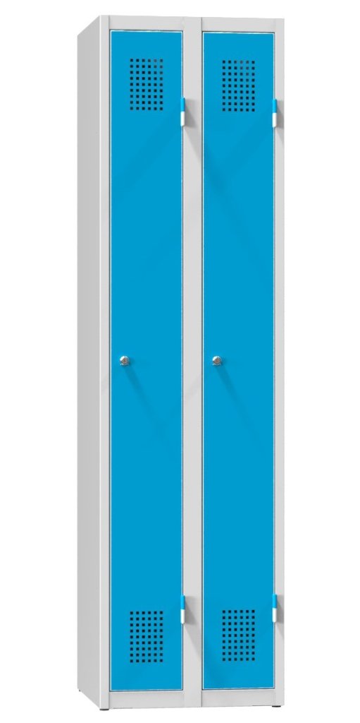 Dvoudveřová kovová šatní skříňka šířka 500 mm, výška 1850 mm, hloubka 500 mm, v horní části každého oddělení je polička a tyč se třemi plastovými háčky. Cena bez štítku pro jmenovku.