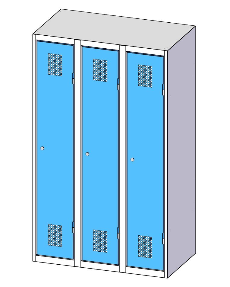 Třídveřová kovová šatní skříňka šířka 750 nebo 900 mm, výška 1500 mm, hloubka 500 mm, v horní části každého oddělení je tyč se celý popis a parametry