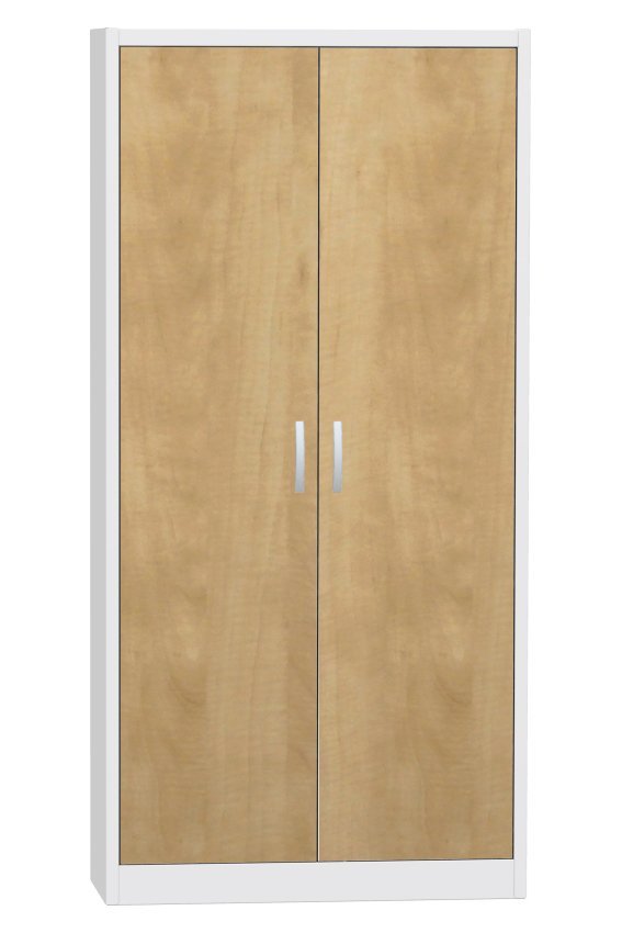 Dvoudveřová skříň se soklem šatní nebo úklidová, šířka 800, výška 1950, hloubka 400 mm, 5 polic. Možnost náhrady plných dveří dveřmi se skleněnou výplní, s drátěnou výplní nebo lamino dveřmi v odstínu buk, bříza nebo třešeň. Barva korpusu RAL 7035 světle šedá.