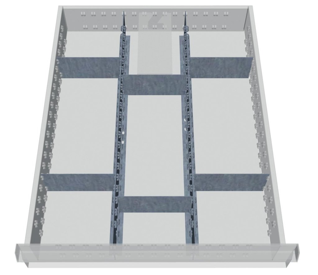 Plastová dělící vložka do zásuvek výšky 100 mm. Vhodné pouze do zásuvkových skříní firmy Bedrunka+Hirth šířky 555 a hloubky 736 mm.