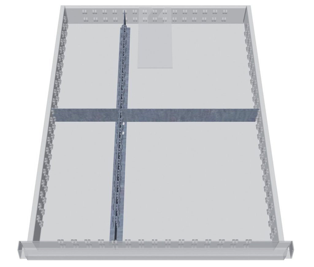 Dělení do zásuvek - set pro 4 zásuvky. Obsahuje 1x gumovou vložku pro zásuvky výšky 50 - 200 mm, 1x plastové dělení pro zásuvky výšky 100 mm, 1x kovové dělení pro zásuvky výšky 100 mm a 1x kovové dělení pro zásuvky výšky 150 mm. Vhodné pouze do zásuvkových skříní firmy Bedrunka+Hirth šířky 555 a hloubky 736 mm.