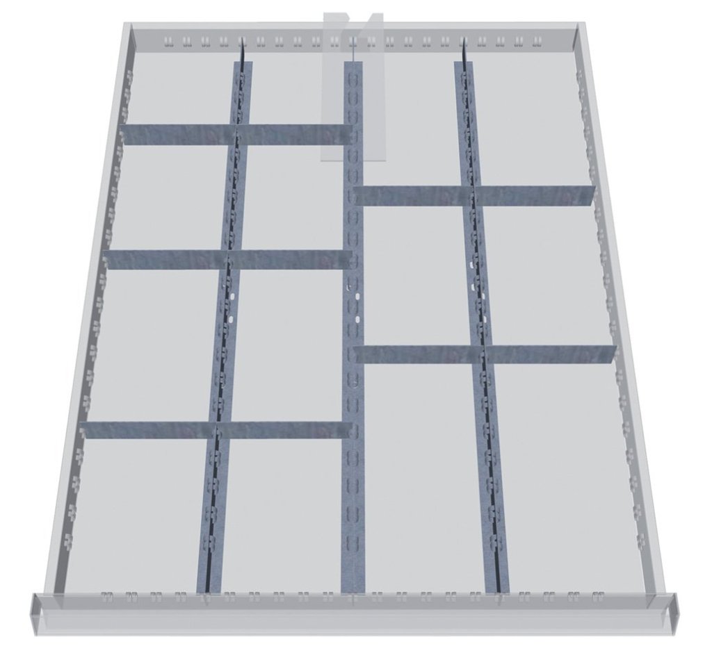 Dělení do zásuvek - set pro 4 zásuvky. Obsahuje 1x gumovou vložku pro zásuvky výšky 50 - 200 mm, 1x plastové dělení pro zásuvky výšky 100 mm, 1x kovové dělení pro zásuvky výšky 100 mm a 1x kovové dělení pro zásuvky výšky 150 mm. Vhodné pouze do zásuvkových skříní firmy Bedrunka+Hirth šířky 555 a hloubky 736 mm.