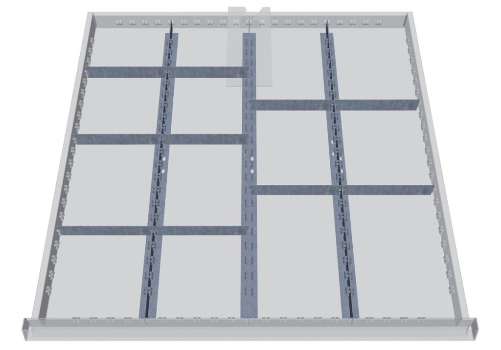 Kovové dělení do zásuvek výšky 100 mm. Vhodné pouze do zásuvkových skříní firmy Bedrunka+Hirth šířky 705 a hloubky 736 mm.