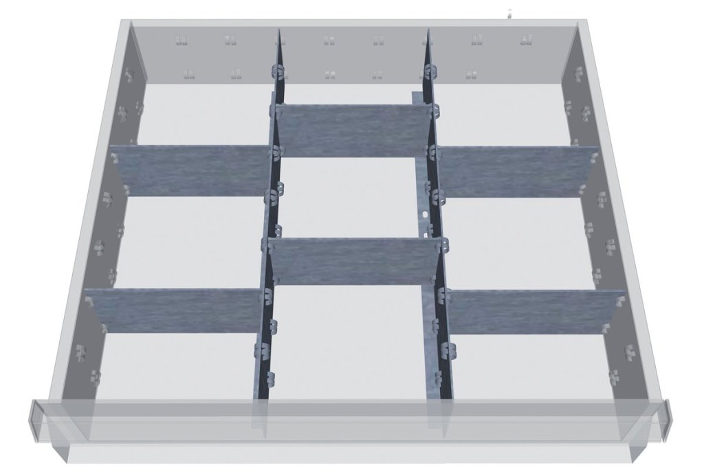 Kovové dělení do zásuvek výšky 100 mm. Vhodné pouze do servisních vozíků firmy Bedrunka+Hirth šířky 530 a hloubky 500 mm.
